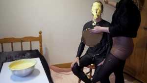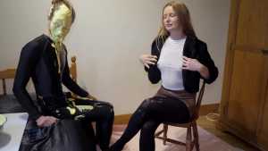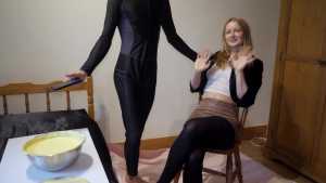 Lex commands the stage in a sleek Lycra one-piece catsuit, hosting a quickfire quiz that puts Lola--stunning in a tight leather skirt, black tights, and a white mesh top--on the clock. Every miss earns a pie, every hit means payback, and the tension builds with playful, flirty energy as the timer ticks down.